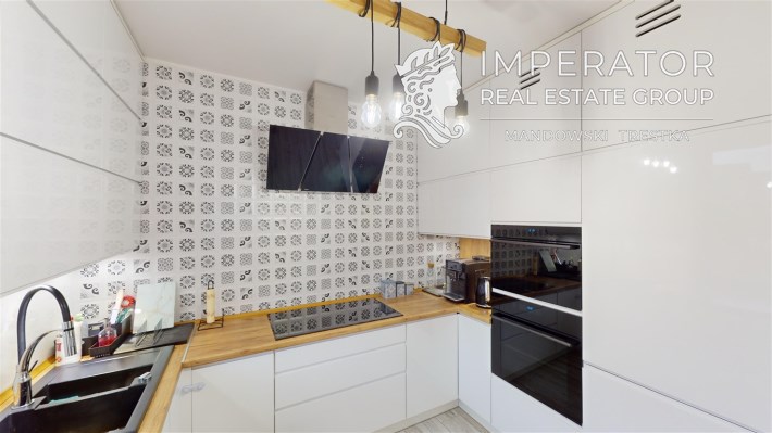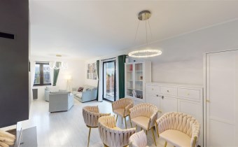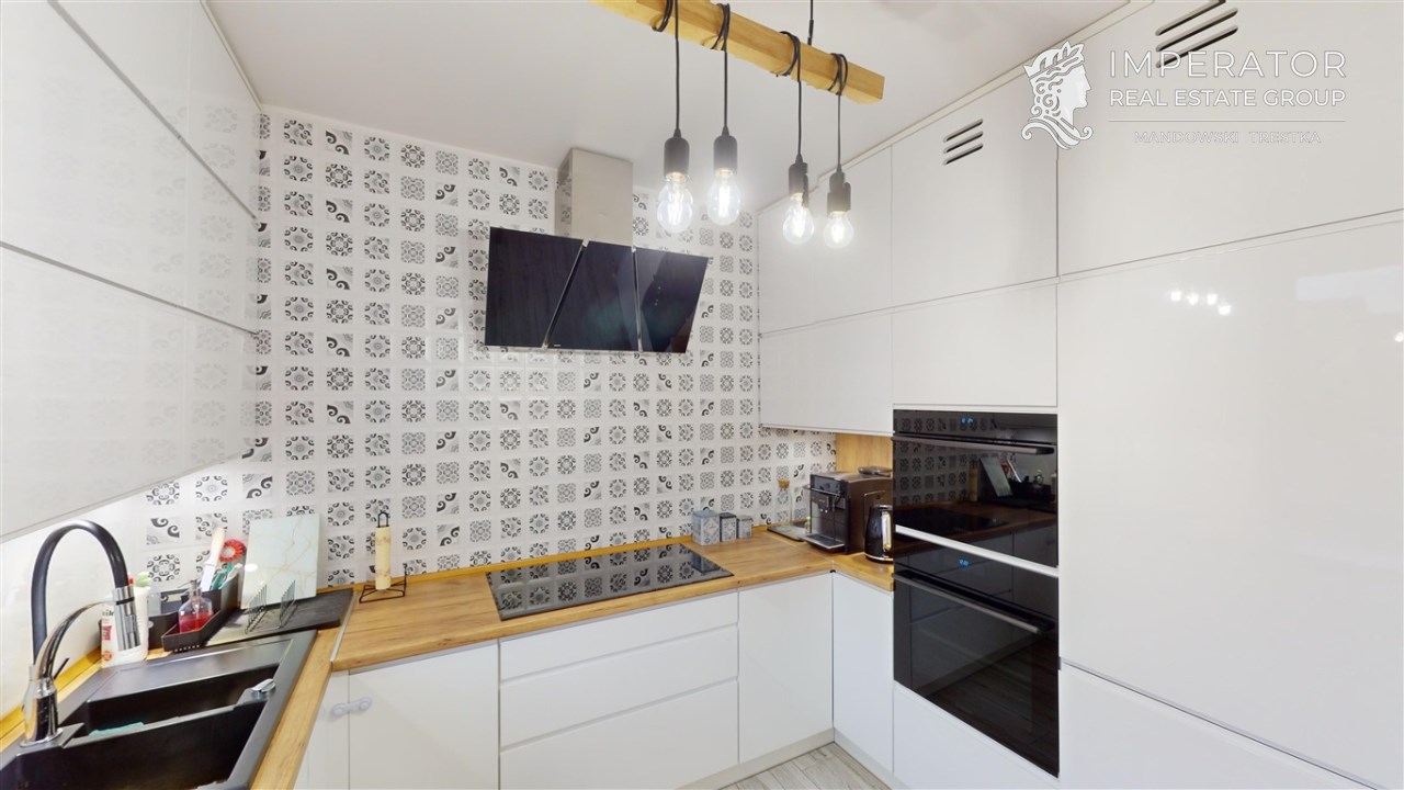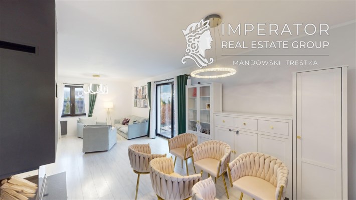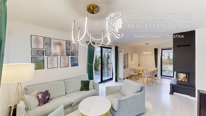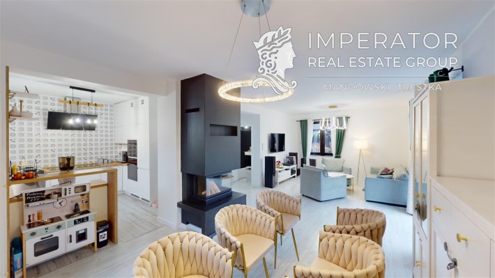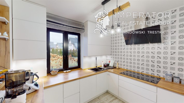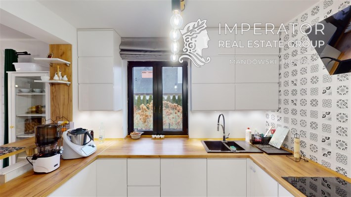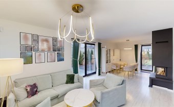 - SALON Z JADALNIĄ I KUCHNIĄ - serce strefy dziennej. Otwarta przestrzeń dobrze doświetlona, z możliwością wyjścia na taras. W salonie znajduje się kominek idealny na długie zimowe wieczory. Kuchnia w prawdzie otwarta, jednak usytuowana bocznie, co daje poczucie kontaktu jak i prywatności. Nowoczesna zabudowa kuchenna - doskonale wykorzystana przestrzeń dzięki meblom robionym na wymiar. Kuchnia w pełni wyposażona w dobrej jakości i sprawny sprzęt AGD