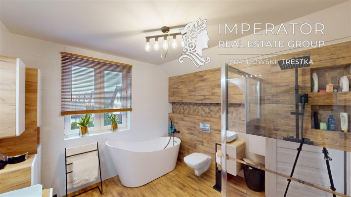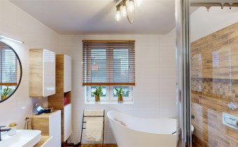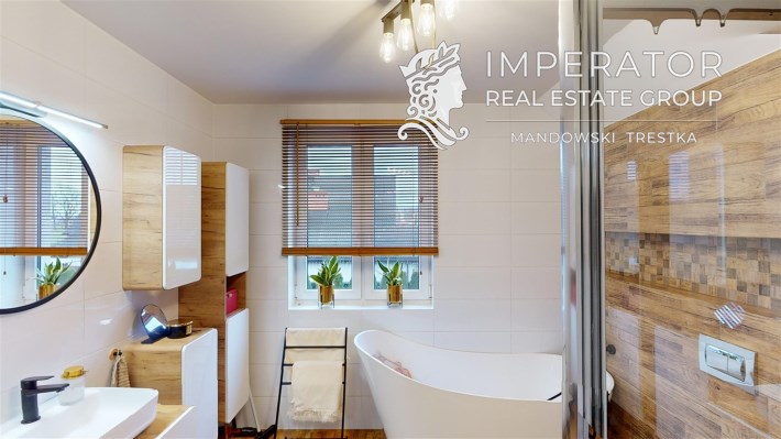 - ŁAZIENKA - z oknem; wyposażona w prysznic bezbrodzikowy, wannę wolnostojącą, podwieszane wc, lustro, umywalkę, liczne szafki