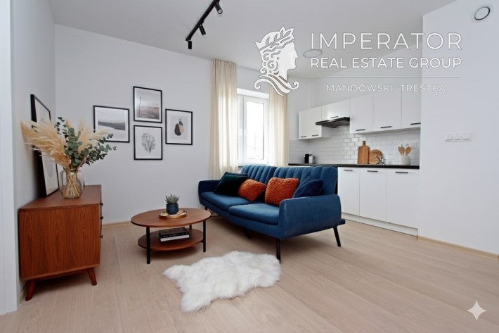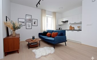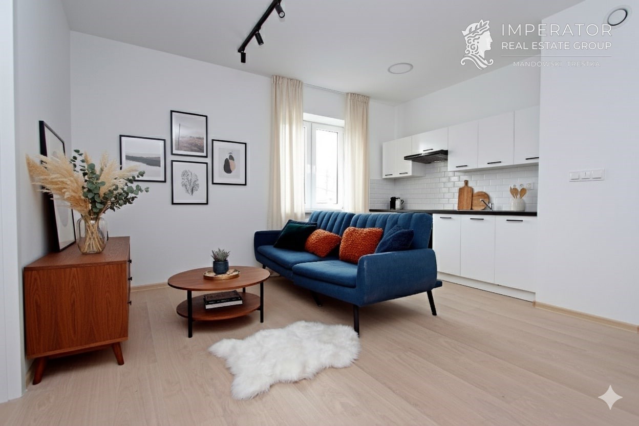 Zdjęcia salonu, pokoju i aneksu kuchennego przedstawiają możliwości aranżacji we własne meble i wyposażenie.