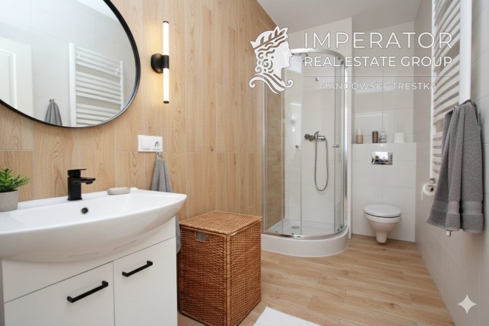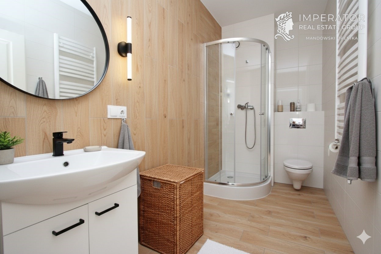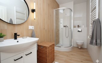 Na podłogach położone zostały panele podłogowe. Została poprowadzona pełna elektryka, a łazienki są już wyposażone w armaturę: wanna / prysznic, umywalka, krany, WC / bidet.