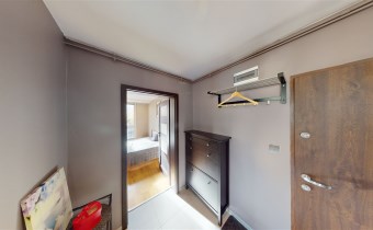 Przedpokój: szafka na buty zamykana, wieszak na ubrania, regał metalowy z szybą, obrazek w ramce, lampa sufitowa